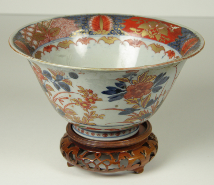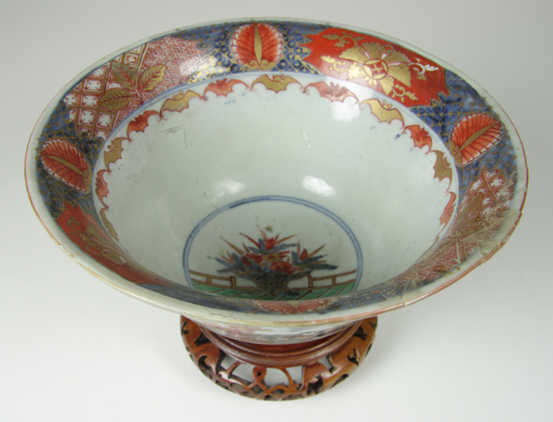 Porseleinen kom, vijfkleuren Imari, buitenwand van bloeiende planten en hekwerk, plat met schaal met bloemen langs de rand, band van vleermuizen.