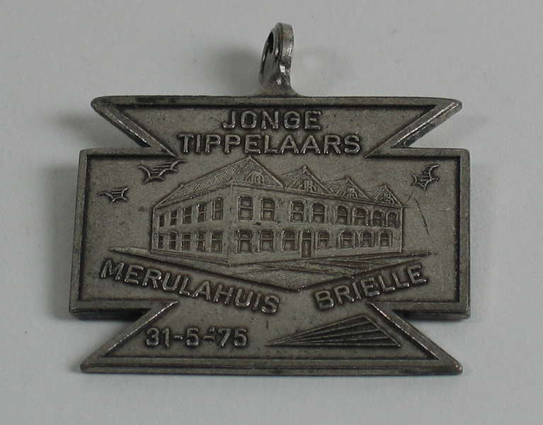 Rechthoekige medaille waarop het Merulahuis in Brielle staat afgebeeld met daarboven de tekst Jonge Tippelaars en daaronder de tekst: 'MERULAHUIS BRIELLE' EN '31-5-'75'.