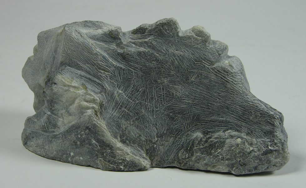 Abstract beeld in de vorm van een rots of een stuk steen. Uit een stuk steen is een grillige vorm gemaakt en in het materiaal zijn diverse krassen gemaakt. De kleur van het beeld is wit/grijs.