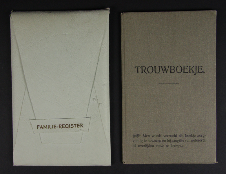 Familieregister van Jannetje Arentje Langendoen en Johannes van Oosten bestaande uit een trouwboekje en een uittreksel in een lichtgroen mapje.