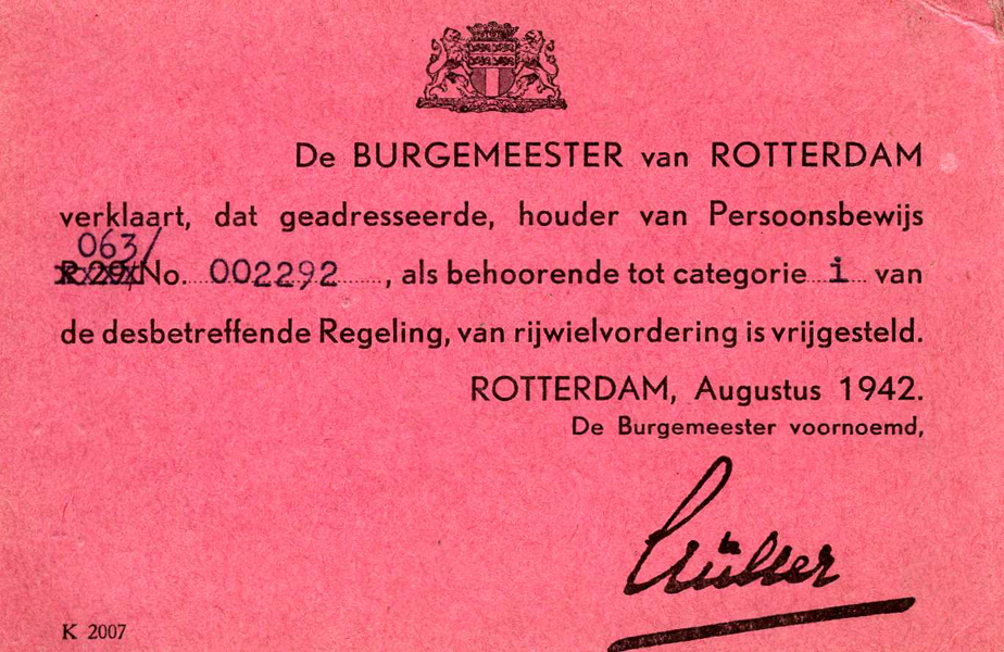 Roze briefkaartje van het gemeentebestuur van Rotterdam over vrijstelling van rijwielvordering.