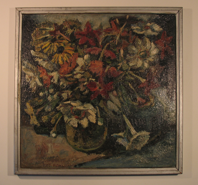Schilderij, olieverf op doek met voorstelling van bloemstilleven. Op de voorgrond staan twee vazen waarin verschillende bloemen zitten. De olieverf is in dikke lagen opgebracht. Gesigneerd linksonder. Schilderij in zilverkleurige, houtenl ijst.