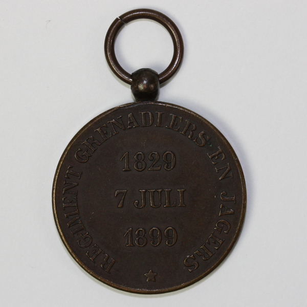Bronzen medaille met op de voorkant een laurierkrans waarbinnen het opschrift 'HERINNERING AAN HET 70 JARIG BESTAAN'. Op de achterkant staat het opschrift 'REGELMENT GRENADIERS EN JAGERS / 1829 / 7 JULI 1899. Aan de medaille zit een ophangoog bevestigd met daarin een ring.