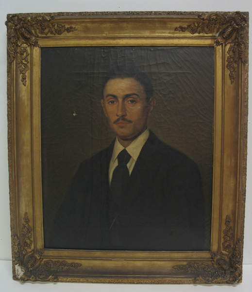 Schilderij, olieverf op linnen met portret van een man. Lichaam van man naar rechts gedraaid, kijkt beschouwer en face aan. De man heeft een donkere jas aan met daaronder een witte overhemd met een zwartkleurige stropdas om. Tegen een donkere achtergrond. Gesigneerd en gedateerd rechtsboven. Schilderij in goudkleurige, geprofileerde lijst met ornamenten op de hoeken.