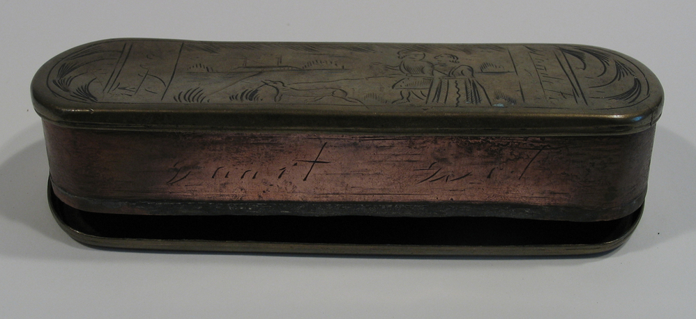 Metalen doos met aan onder- en bovenkant een gegraveerde voorstelling. Bovenkant: Wandelende man en vrouw met hond. Op achtergrond landschap. Onderkant: Wandelende man met hond, met op achtergrond een onbekend gebouwl/stad. Op onder- en bovenkant en de twee zijkanten is onleesbare tekst gegraveerd. Het is onduidelijk waar dit doosje voor bestemd is geweest. Wel zat ...