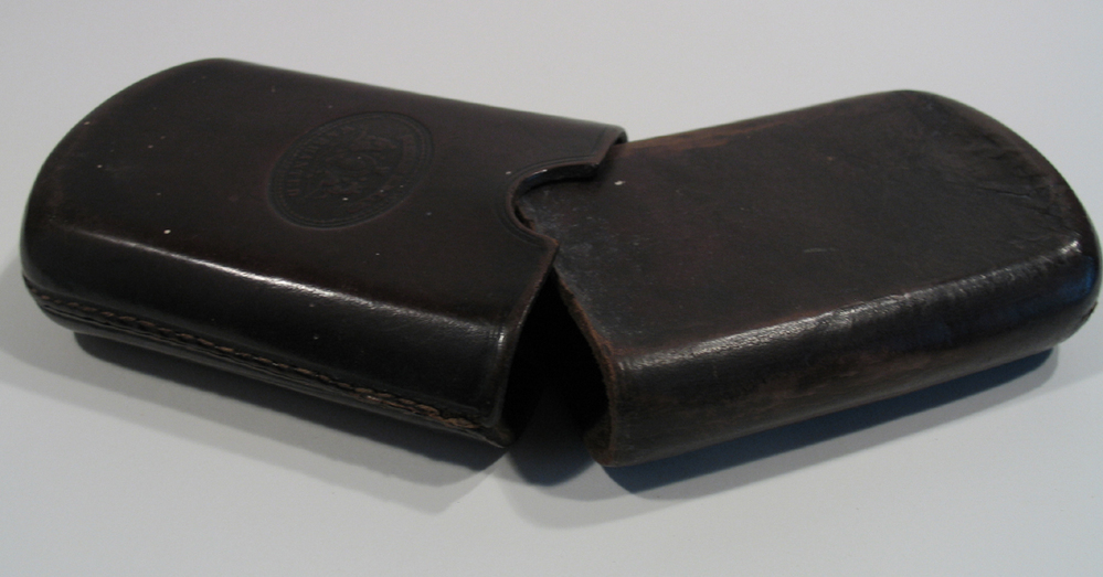 Leren sigarenkoker, bestaande uit twee delen die je in elkaar kunt schuiven. Op bovenkant een onbekend wapen met onderschrift; 'WARRANTED'