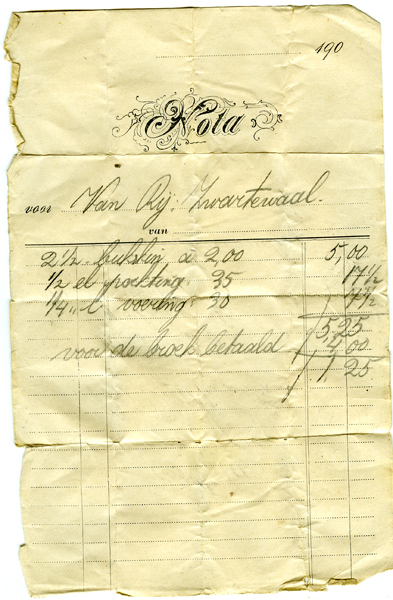 Diverse documentatie waaronder prijslijst/advertentie van Volks-Apotheek N. Spetter & Co te Rotterdam, een nota, een feestlied, twee advertenties (?) van drogist A.W. van den Berg, drie krantenartikelen uit; de Veldpost, Rotterdamsch Nieuwsblad en de Courant van Rotterdam. Documentatie zaten in kist 4671. Kist met inhoud (objectnummers 4672 t/m 4704) is afkomstig van vader (Dhr. A. ...