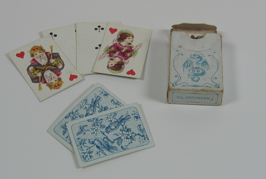 Spel kaarten in doosje bestaande uit 51 kleine kaarten. Op de kaarten ontbreken de cijfers. Waarde van een kaart wordt afgebeeld met hoeveelheid harten, klaver, ruiten of schoppen. Op achterzijde van de kaart een blauwe afbeelding van twee vogels in een tak met bloemen.