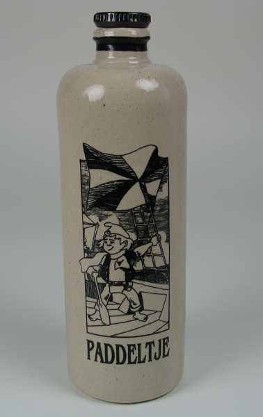Stenen kruik, crème, zijnde een koffielikeur genaamd 'Paddeltje'. Met zwarte dop zonder inhoud. Op de voorkant een zwarte afbeelding Paddeltje met de Geuzenvlag. Op de achterkant zwarte opschriften en afbeelding van Johan Been.