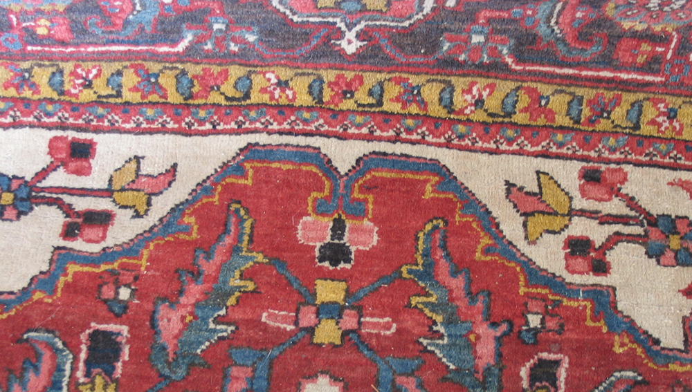 Perzisch tapijt voorzien van blad- en bloemmotieven en diverse ornamenten in o.a. de kleuren rood, geel en blauw.