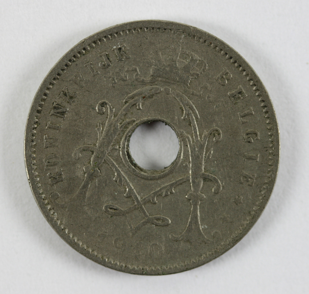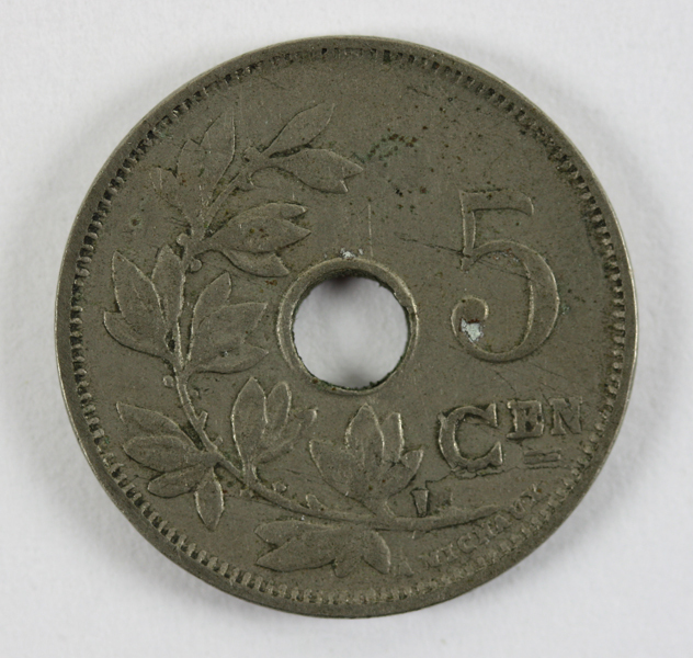 Vijf centimes munt uit België. Op de voorzijde het gekroonde monogram van Leopold en een rondschrift met jaartal. Op de keerzijde een afbeelding van een lauriertak en de waarde. In het midden zit een gat.