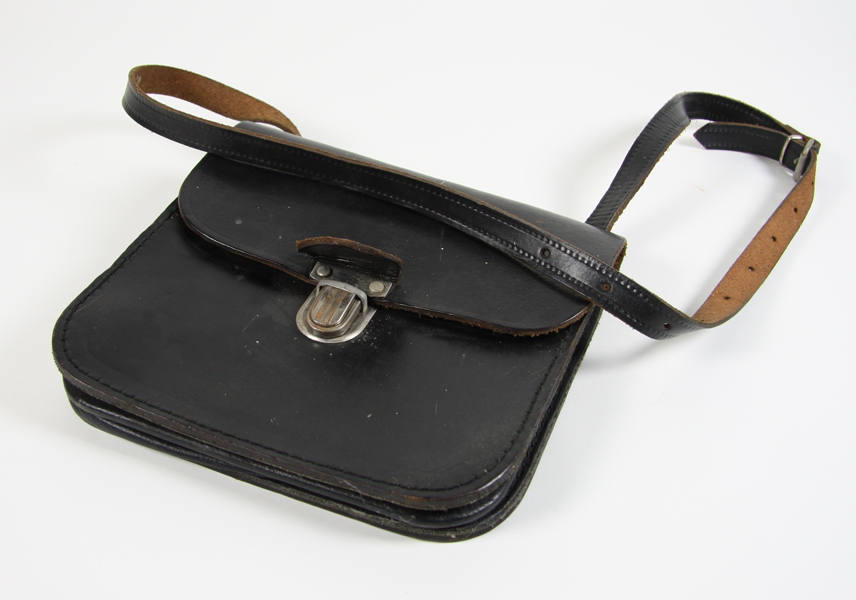 Zwart leren geldtas met draagriem. Aan de voorzijde een metalen sluiting. Aan de binnenzijde drie vakken. Aan de riem een metalen gesp.