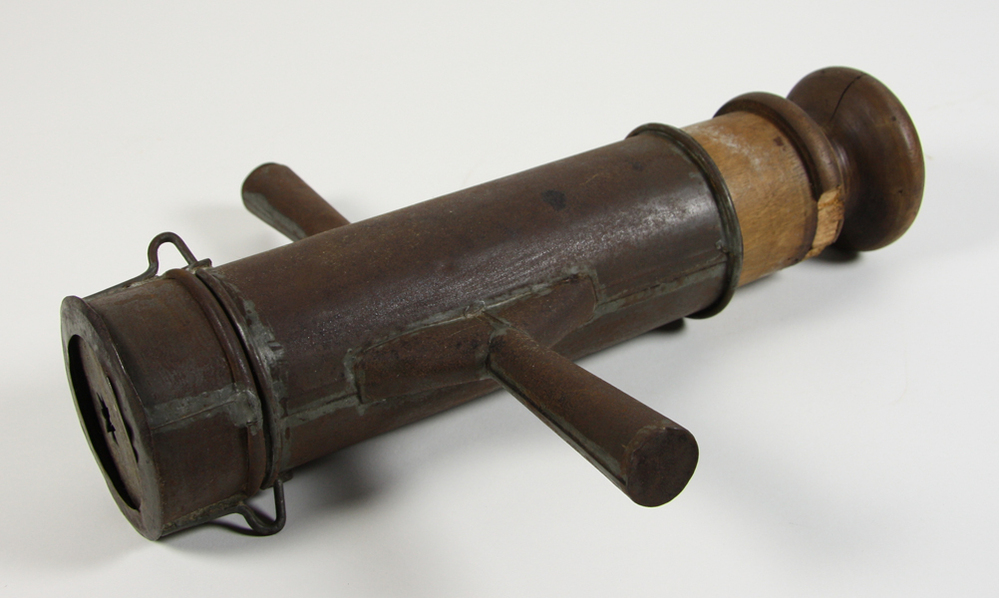 Spritsspuit. Bestaat uit een houten duwer en een metalen koker met onderin een stervorm.