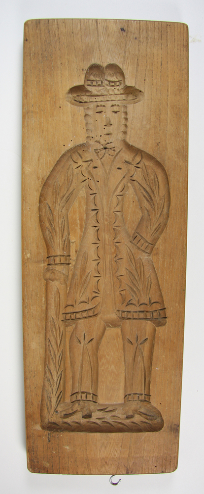 Houten speculaasplank met aan de voorzijde een uitgesneden afbeelding van een vrouw. Aan de achterzijde een afbeelding van een man. Aan de bovenzijde is een haakje geschroefd.