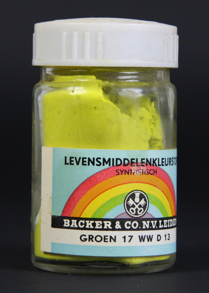 Glazen potje met wit kunststof deksel. Gevuld met levensmiddelenkleurstof. Werd gebruikt voor het kleuren van marsepein. Op de voorzijde een etiket met een afbeelding van een regenboog, de naam en het logo van de fabrikant en de naam en het nummer van de kleur.