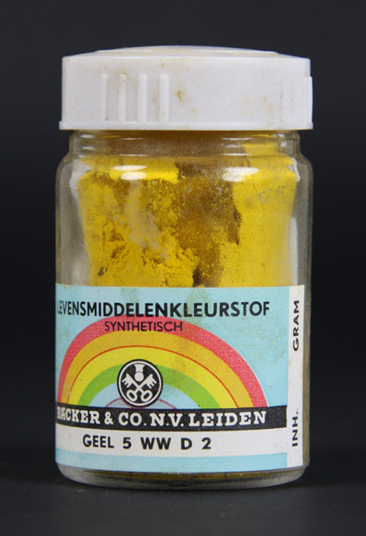 Glazen potje met wit kunststof deksel. Gevuld met levensmiddelenkleurstof. Werd gebruikt voor het kleuren van marsepein. Op de voorzijde een etiket met een afbeelding van een regenboog, de naam en het logo van de fabrikant en de naam en het nummer van de kleur.