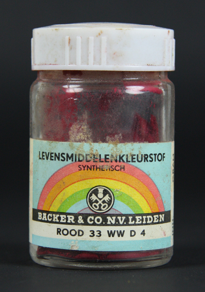 Glazen potje met wit kunststof deksel. Gevuld met levensmiddelenkleurstof. Werd gebruikt voor het kleuren van marsepein. Op de voorzijde een etiket met een afbeelding van een regenboog, de naam en het logo van de fabrikant en de naam en het nummer van de kleur.