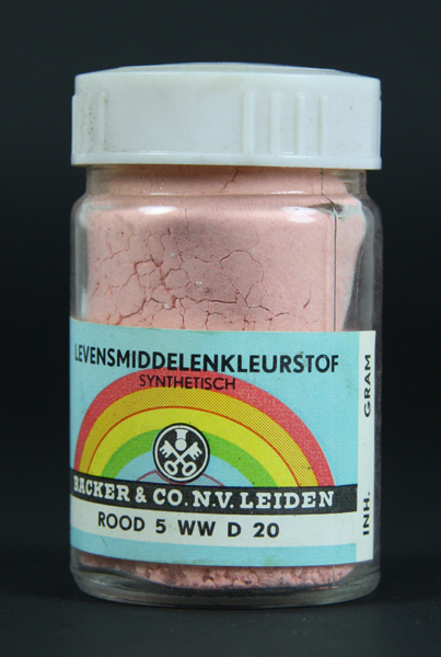 Glazen potje met wit kunststof deksel. Gevuld met levensmiddelenkleurstof. Werd gebruikt voor het kleuren van marsepein. Op de voorzijde een etiket met een afbeelding van een regenboog, de naam en het logo van de fabrikant en de naam en het nummer van de kleur.