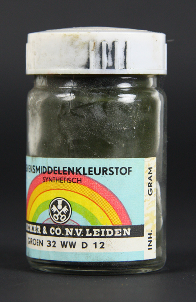 Glazen potje met wit kunststof deksel. Gevuld met levensmiddelenkleurstof. Werd gebruikt voor het kleuren van marsepein. Op de voorzijde een etiket met een afbeelding van een regenboog, de naam en het logo van de fabrikant en de naam en het nummer van de kleur.