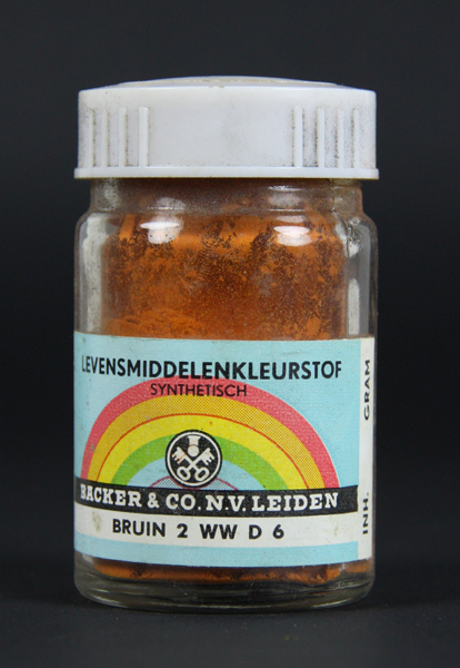 Glazen potje met wit kunststof deksel. Gevuld met levensmiddelenkleurstof. Werd gebruikt voor het kleuren van marsepein. Op de voorzijde een etiket met een afbeelding van een regenboog, de naam en het logo van de fabrikant en de naam en het nummer van de kleur.