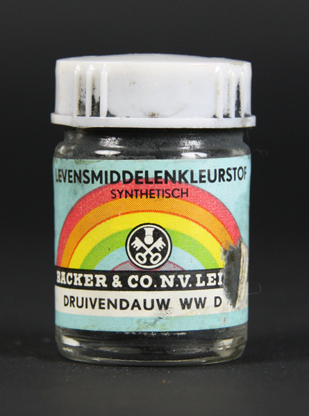 Glazen potje met wit kunststof deksel. Gevuld met levensmiddelenkleurstof. Werd gebruikt voor het kleuren van marsepein. Op de voorzijde een etiket met een afbeelding van een regenboog, de naam en het logo van de fabrikant en de naam en het nummer van de kleur.