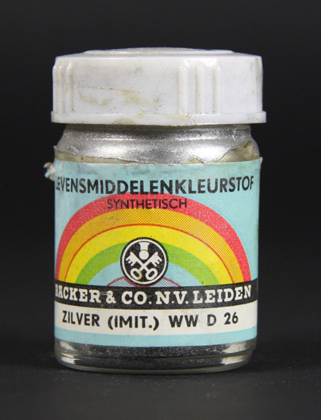 Glazen potje met wit kunststof deksel. Gevuld met levensmiddelenkleurstof. Werd gebruikt voor het kleuren van marsepein. Op de voorzijde een etiket met een afbeelding van een regenboog, de naam en het logo van de fabrikant en de naam en het nummer van de kleur.