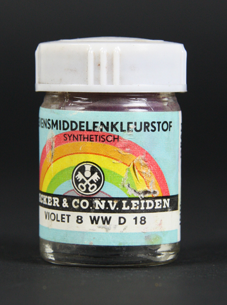 Glazen potje met wit kunststof deksel. Gevuld met levensmiddelenkleurstof. Werd gebruikt voor het kleuren van marsepein. Op de voorzijde een etiket met een afbeelding van een regenboog, de naam en het logo van de fabrikant en de naam en het nummer van de kleur.