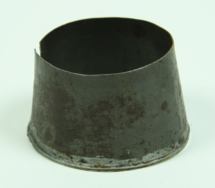 Metalen uitsteekvorm. Lage bekervormige koker met gladde rand. Licht vervormd en de naad heeft iets losgelaten.