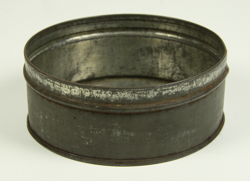 Rond metalen blik. Met bijhorend deksel en tien in elkaar passende uitsteekvormen.