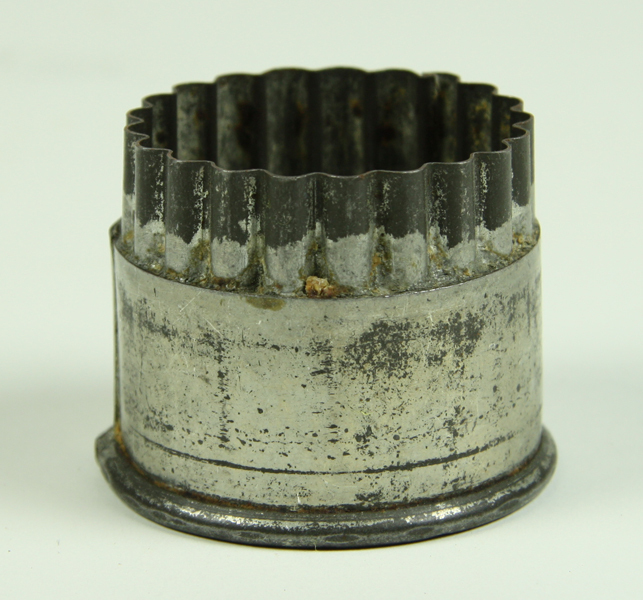 Ronde blikken uitsteekvorm met geschulpte rand. In de uitsparingen zitten nog deegresten.