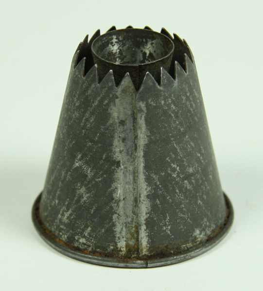 Blikken spuitmond met tandjes langs de bovenrand. In de spuitopening een omgekeerde kegelvormige koker op een dwarsverbinding gesoldeerd.