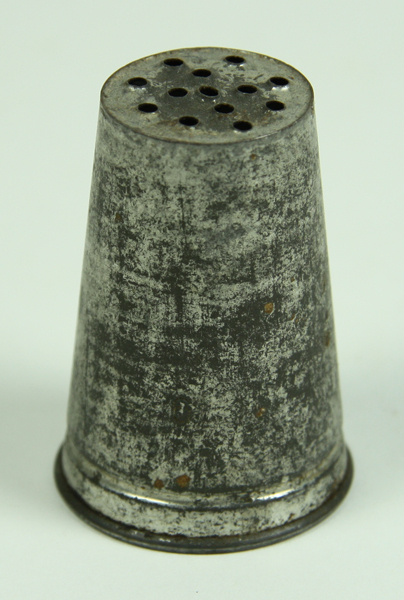 Blikken spuitmond met gaatjes in de bovenzijde. Langs de onderrand een lijn.