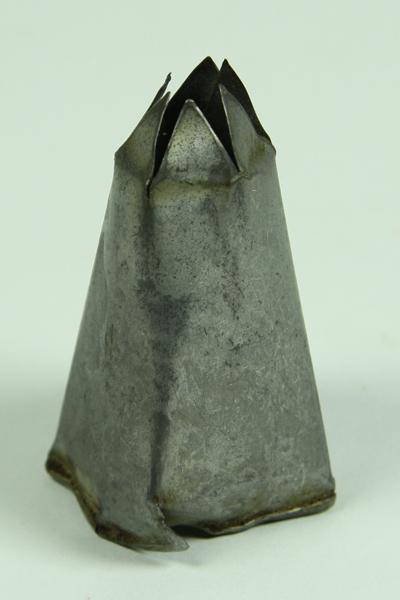 Metalen kegelvormige spuitmond met getande rand. Aan de voorzijde het opschrift 1. Het geheel is vervormd. Aan de onderzijde op vijf plaatsen scheuren in het metaal. De naad is bovenaan los geraakt.