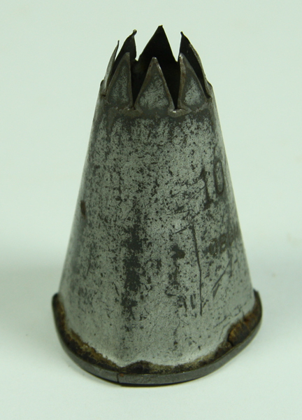 Blikken kegelvormige spuitmond met getande rand. Aan de voorzijde het opschrift 10. Langs de onderrand deegresten. Geheel is vervormd.