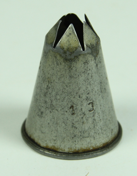 Blikken kegelvormige spuitmond met getande rand. Aan de voorzijde het opschrift 13. Langs de onderrand een donkere aanslag.