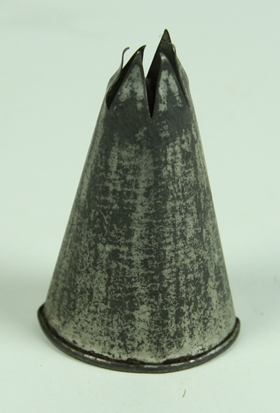 Blikken kegelvormige spuitmond met getande rand. Op de voorzijde het opschrift 6. De naad is opnieuw gesoldeerd.