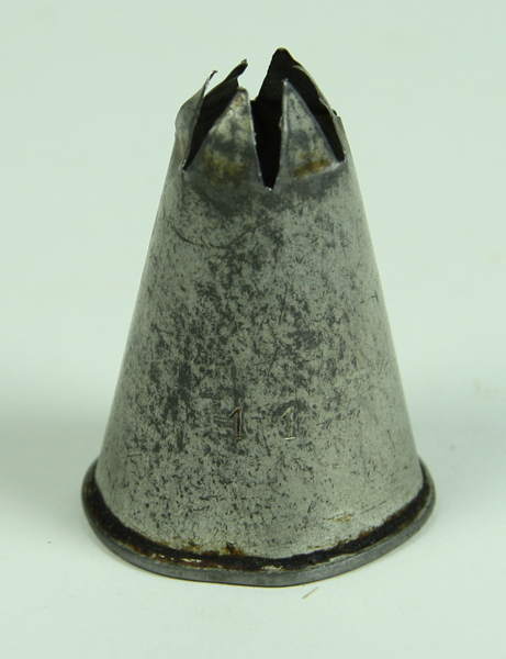 Blikken kegelvormige spuitmond met grof getande rand. Op de voorzijde het opschrift 11. Onderaan langs de rand een donkere verkleuring.