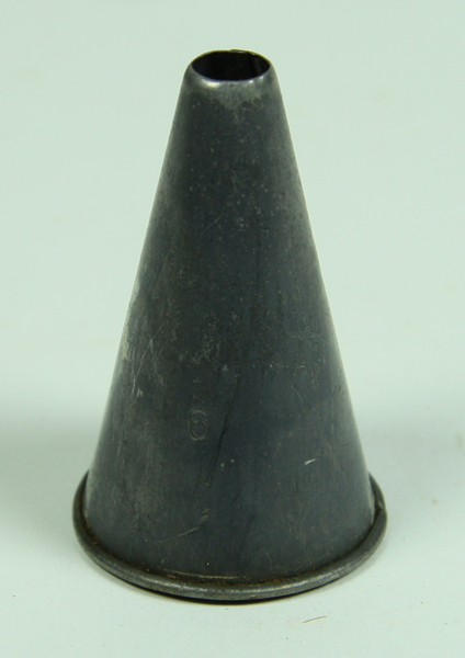 Blikken kegelvormige spuitmond met gladde rand. Aan de voorzijde het opschrift 6. Langs de onderrand deegresten.