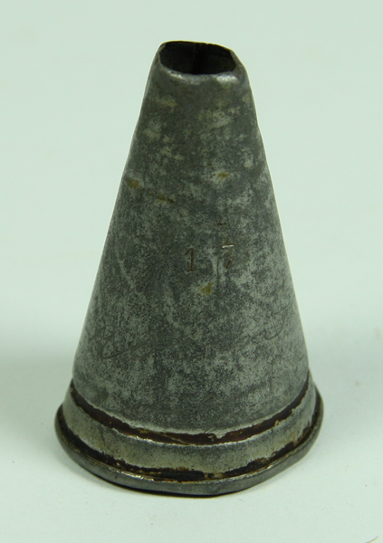 Blikken kegelvormige spuitmond met gladde bovenzijde. Aan de voorzijde het opschrift 17. Onderaan een gestanste rand. Niet geheel rond.