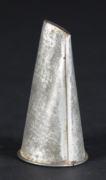 Grootste van set van vier in elkaar passende blikken spuitmonden. De spuitopening is een verticale streep. de grondvorm is rond.