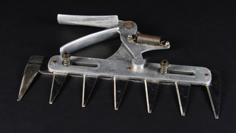 Aluminium hakselmes. Bestaat uit zes lemmeten aan een handvat.