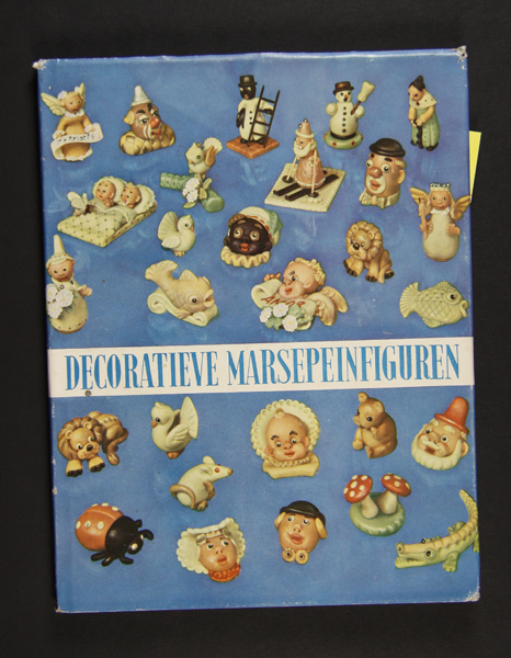 Omslag van het boek ' Decoratieve marsepeinfiguren'. Op een blauwe achtergrond afbeeldingen van verschillende marsepeinfiguren, zoals een engeltje, lieveheersbeestje, vissen, padddestoelen en diverse hoofdjes.