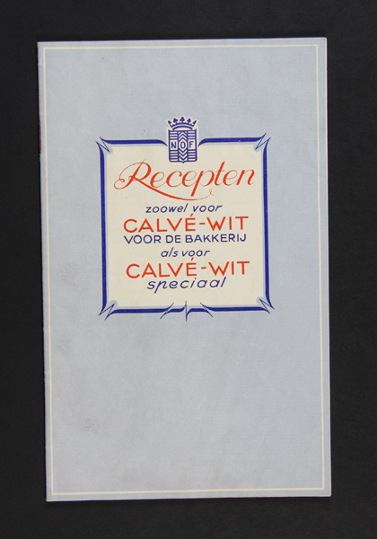 Receptengidsje van oliefabrieken Calvé. Met 26 recepten voor taart, koekjes, schuim, slagroom, beslag en ijs. De omslag is lichtblauw met een witte bies en een schild met de titel en het logo van de Calvéfabriek.