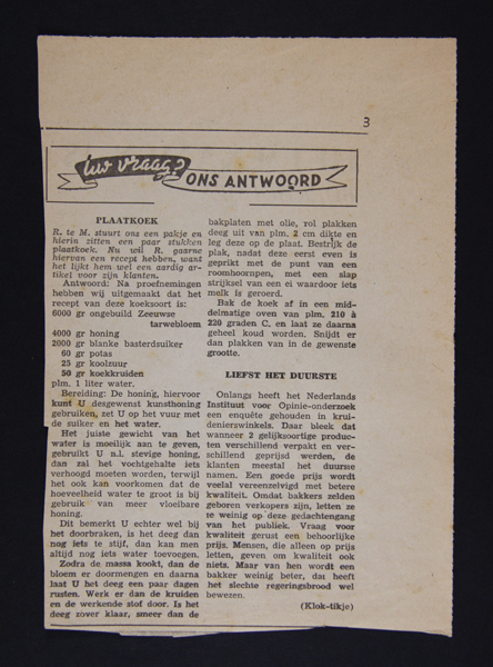 Krantenartikeltje met een recept voor plaatkoek. Daarnaast een artikeltje over de verhouding prijs-kwaliteit en prijsbepaling voor bakkers. Op de achterzijde een deel van een artikel over het examen boekhouden bij de Patroonsexamens broodbakkerij.