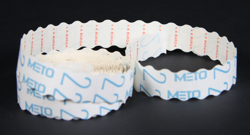 Prijsstickers, opgerold om een kunststof cirkel. Langs de bovenrand in rode inkt het opschrift v.d. BURGH. Op de achterzijde in blauw het opschrift METO 22.