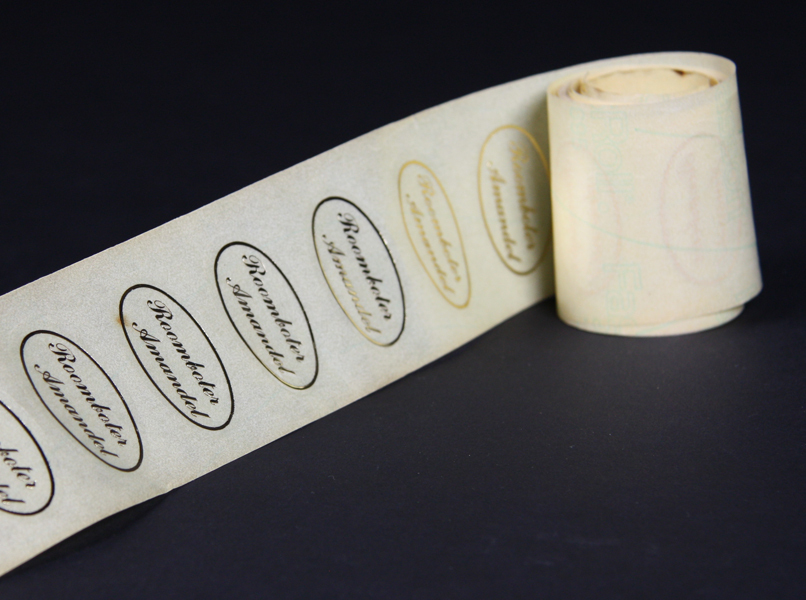 Rol stickers met goudkleurig opschrift Roomboter Amandel. Stickers zijn doorzichtig, ovaal van vorm met een goudkleurig randje om het opschrift.