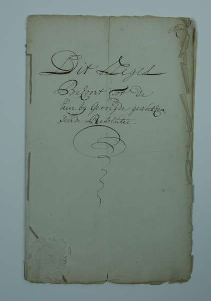 Document, voorkant getiteld: 'Dit zegel Behoort tot de hier bij gevoegde geau..?en,, ..leerde Resolutie.' Rechtsboven blindstempel met rijkswapen en opschrift: 'SEGEL 1727 CLEIN'. Linksonder een papieren zegel met daarop blindstempel met rijkswapen. Document wordt gebonden door touw. Inhoud o.a. over verkoop van land rondom Rozenburg.