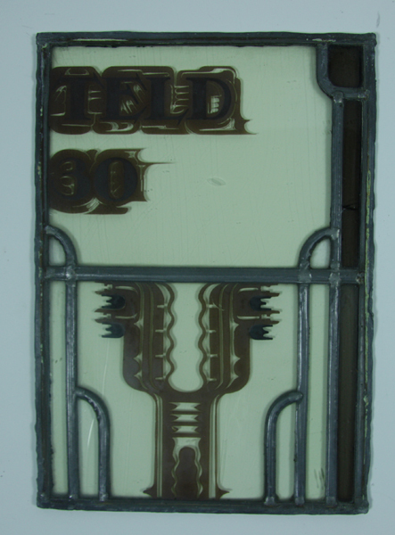 Glas-in-loodraam, bruin en blank, met bruine en zwarte decoratie en met opschrift: 'TELD 30'.