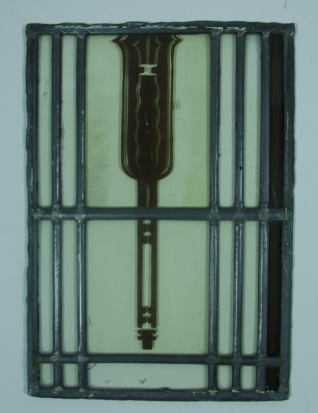 Glas-in-loodraam, bruin en blank, met bruine en zwarte decoratie.