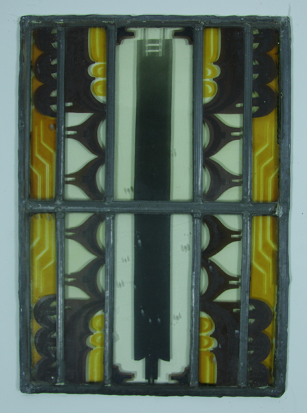 Glas-in-loodraam, met decoratie in de kleuren zwart, bruin en donkergeel.